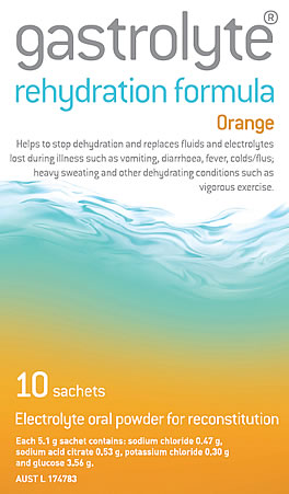 Gastrolyte Rehydration Preparations contain a balanced solution of glucose and electrolytes. They have been carefully formulated to help replace fluids and electrolytes lost due to dehydrating illnesses such as diarrhoea, vomiting, fever, colds and flu. These formulas are easy to take and prepare anywhere. They are suitable for travellers, sports people or adults and children suffering from mild dehydration.Gastrolyte is available in a number of handy formats and flavours: